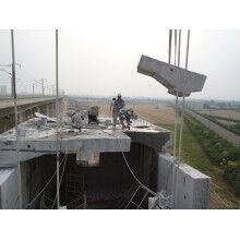 4、 切割拆除時,機械吊裝應進行提前預吊,用鋼絲繩套緊鉆裝孔.檢查確保臨時支撐的穩(wěn)固性能,與切割相鄰梁體的端頭用臨時支撐先撐好方可切割作業(yè).